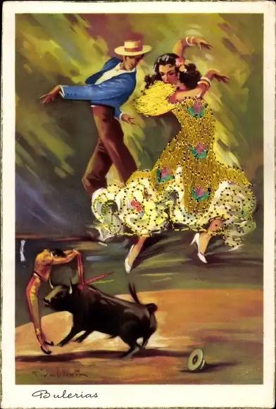 Seidenstick Ak Stierkampf, Flamenco-Tänzer in Trachten