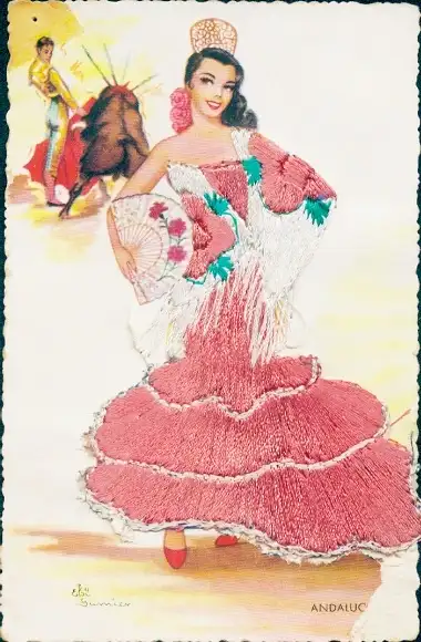 Seidenstick Künstler Ak Gumier, E., Andalusien, Frau in spanischer Tracht, Torero, Stierkampf