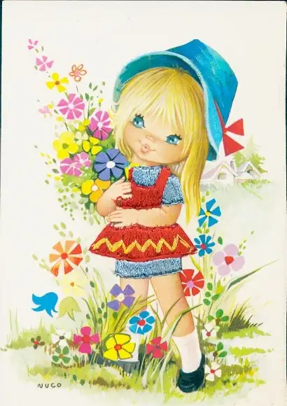 Seidenstick Künstler Ak Nuco, Mädchen auf Blumenwiese, Hut