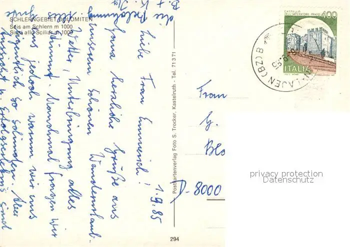 Seis_am_Schlern Kirche Berge Burg Hotel Seis_am_Schlern postalisch gelaufen 1985 Erhaltung siehe scans [KathaD81] Kathoren