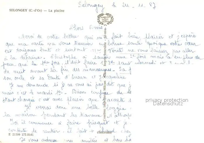 Selongey La piscine Selongey postalisch nicht gelaufen 1987 Erhaltung siehe scans [WerneD78] WernPID7