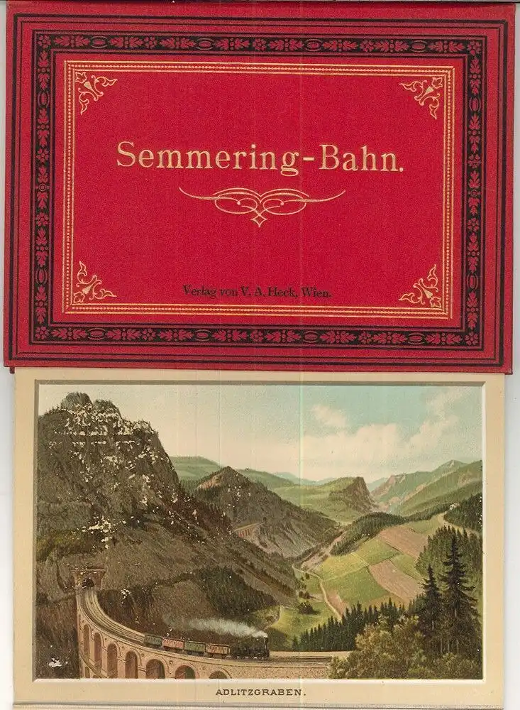 Bemerkungen: Nebehay-Wagner 946 - Leporello mit Ansichten entlang der Semmering-Bahn-Strecke. Gezeigt wird: Payerbach, Klamm, Schottwien mit Sonnwendstein, Schneeberg, Weinzettelwand, Adlitzgraben, Semmering Hotel, Raxalpe vom Semmering Hotel, Station Semmering und Mürzzuschlag. Das Leporello erschien ohne Titel- und Textblätter. Den Chromolithographien liegen Aquarelle des Wiener Landschafts- u. Genremalers August Gerasch d. Ä. (1828-1908) zu Grunde.