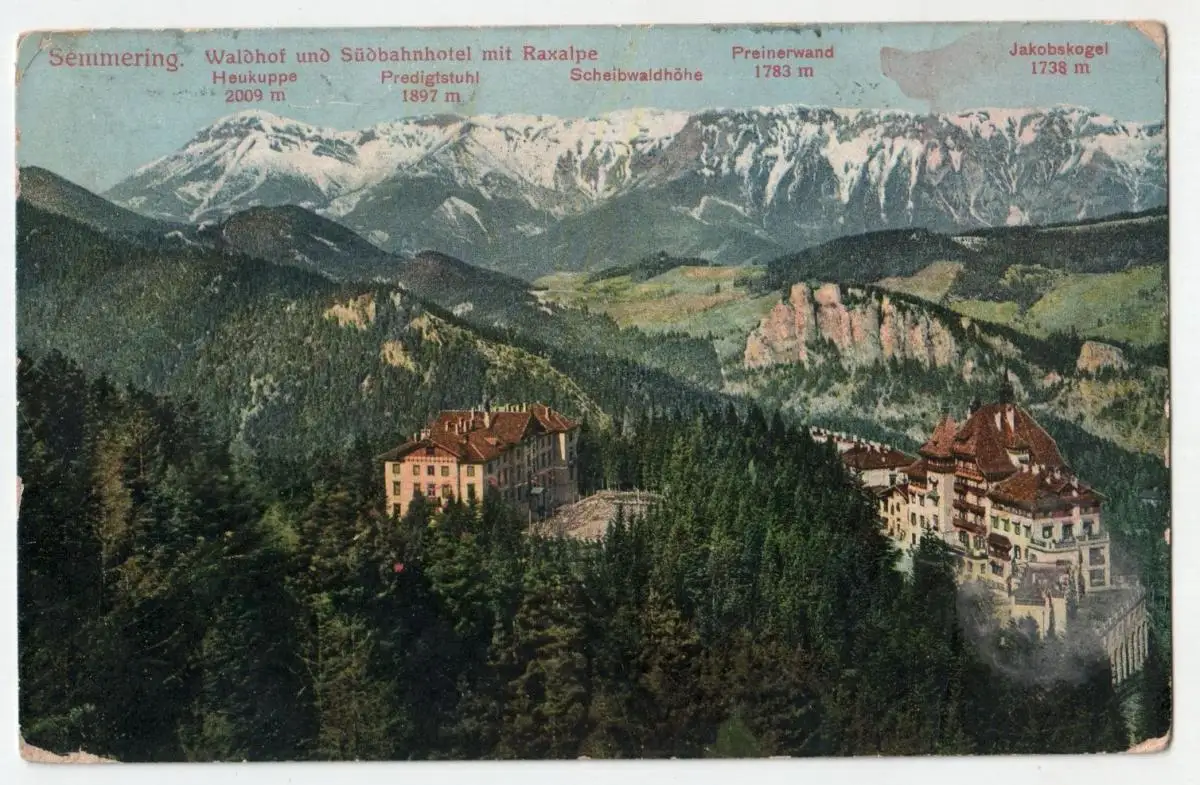 Semmering. Waldhof und Südbahnhotel mit Raxalpe