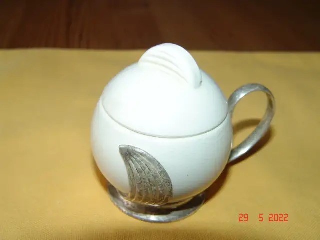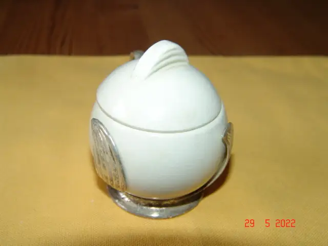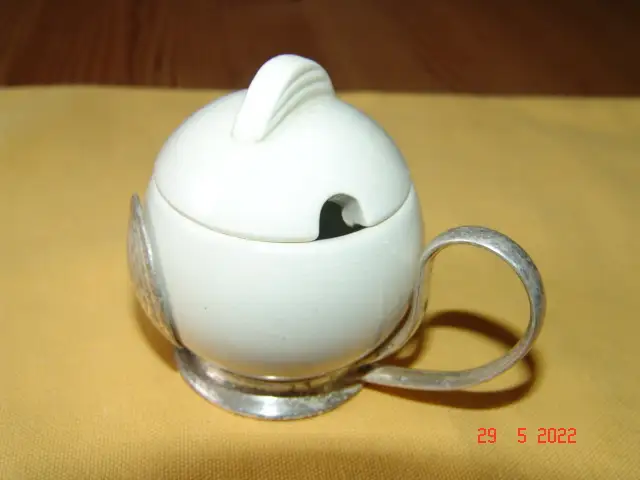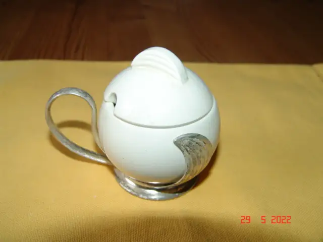 Angeboten wird ein Designklassiker aus den 30er Jahren ( Art Deco ), ein Senftöpfchen mit Deckel in einem versilberten Halter mit Blattdesign.