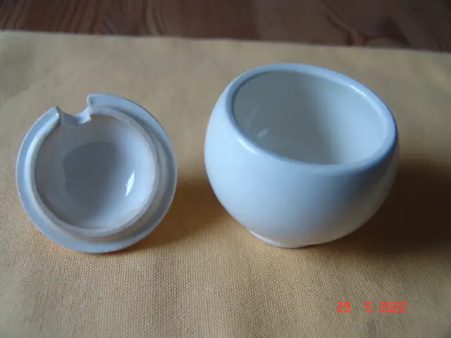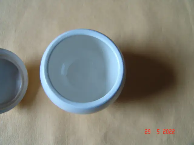 Das Deckeltöpfchen mit Aussparung im Deckel ist aus Keramik und in altersgemäß sehr gutem Zustand, keine Abplatzer, Sprünge o.ä.. Es gibt leichte Glasursprünge.