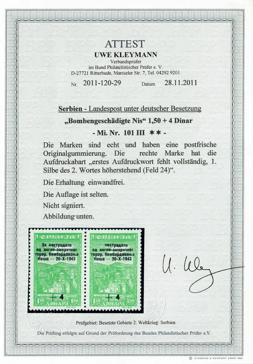 Serbien MiNr. 101 III, postfrisch, ** Aufdruck-Abart, BPP Attest