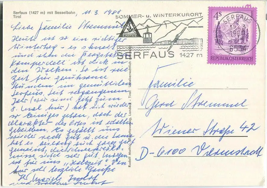 Serfaus - Sesselbahn - Verlag Rudolf Mathis Landeck (G38310) gel. 1980