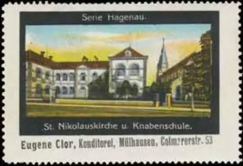 St. Nikolauskirche und Knabenschule, Größe/Zustand: 5x7 , guter Zustand, Original alte Reklamemarke die seinerzeit für die Werbung benutzt wurde