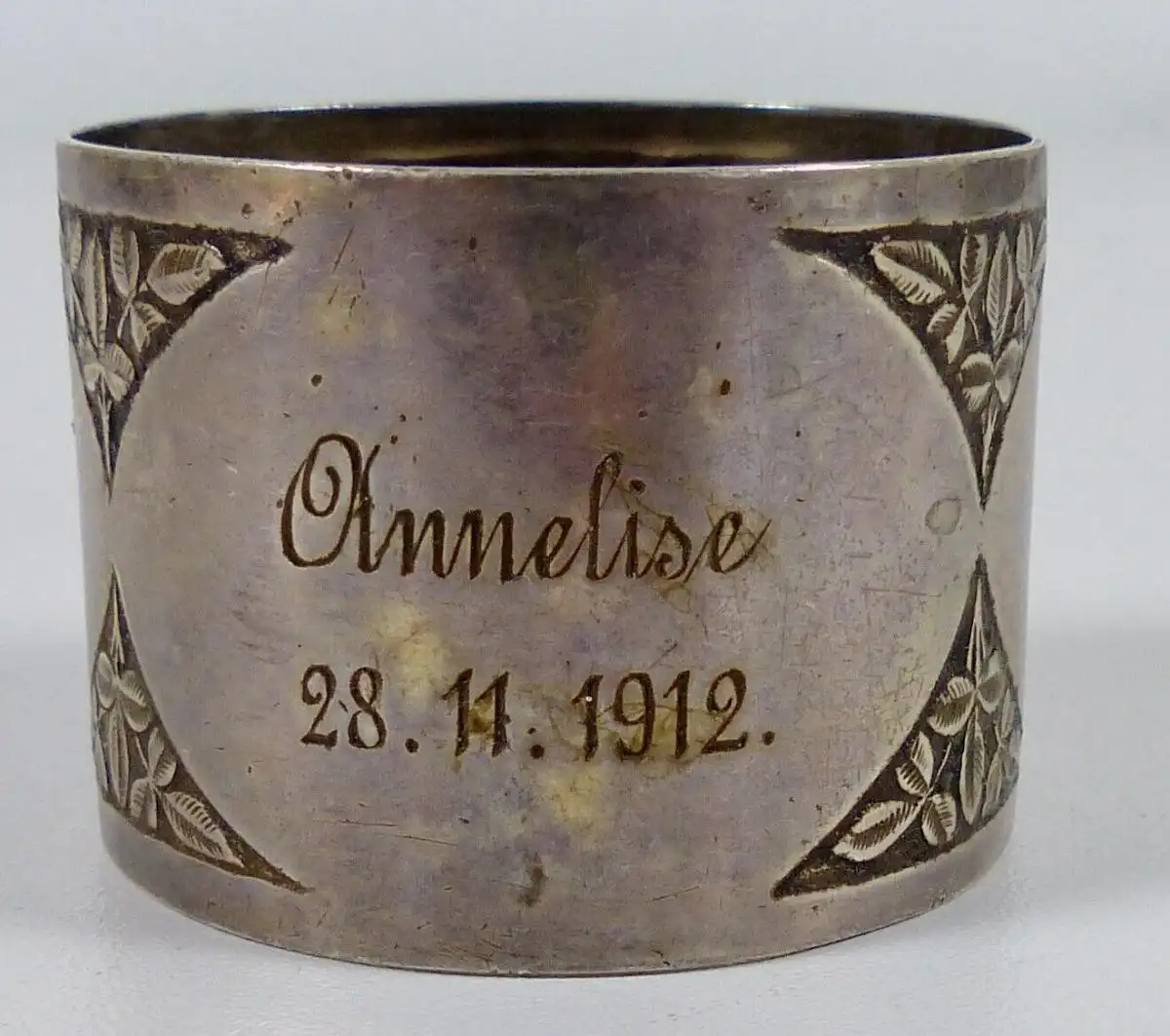 Schauen sie auch gerne in unsere Auktionen und in unseren Shop Serviettenring aus 800er Silber mit Monogramm Anneliese 28.11.1912Größe ca. 5 cm, Höhe 3,6 cmGewicht ca. 45,9 Grammin guter gebrauchter Erhaltung, etwas verbogen, nicht gereinigt Die Fotos sind Bestandteil des Angebots. Auktionbedingungen über Zahlung und Versand: Bezahlung fällig nach Auktionsende. Keine Schecks!!! No checks!!! Sie werden innerhalb von 24 Stunden nach Auktionsende von uns über ebay automatisch angeschrieben. Unser Unternehmen nimmt an dem Befreiungssystem gem. § 6 Abs. 3 (ab 01.01.2009 § 6 Abs. 5) VerpackV teil, wir haben einen FREISTELLUNGSVERTRAG mit der Landbell AG geschlossen. Bitte beachten Sie auch meine anderen Auktionen! Antikhandel Wilfried Boschan Steuer ID DE 167790774 Mehrwertsteuerhinweis: Unsere Artikel unterliegen der Differenzbesteuerung, nach §25a UStG Bei den angebotenen Artikeln handelt es sich um gebrauchte Ware, ein gewisses Maß an Alterungs- und Gebrauchsspuren ist immer vorhanden. Wir geben uns die größte Mühe alles genauestens zu beschreiben, aber wir sind nur Menschen und Menschen machen manchmal Fehler.