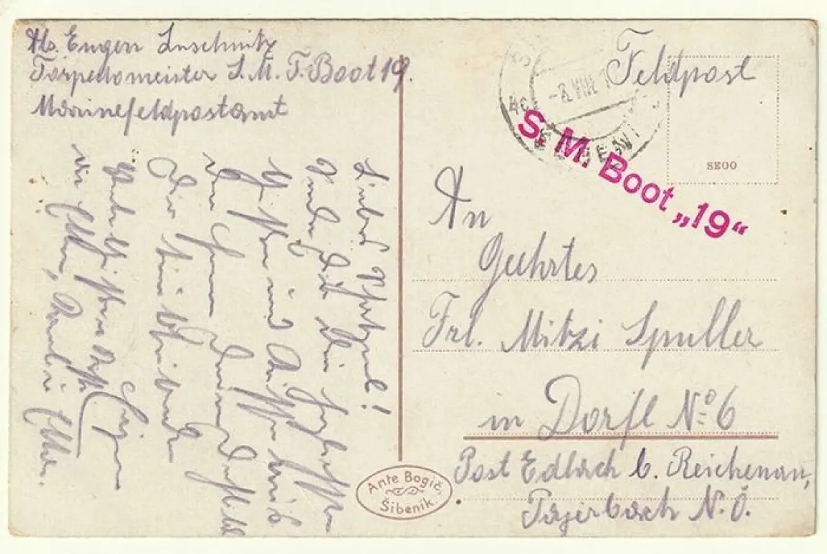 Bemerkungen: Gelaufen m. Stempel: S.M. Boot 19 - roter Einzeiler - KALIS 2 -P. 30 neben Sibenik/ 8.VIII.17/4 c Sebenico.