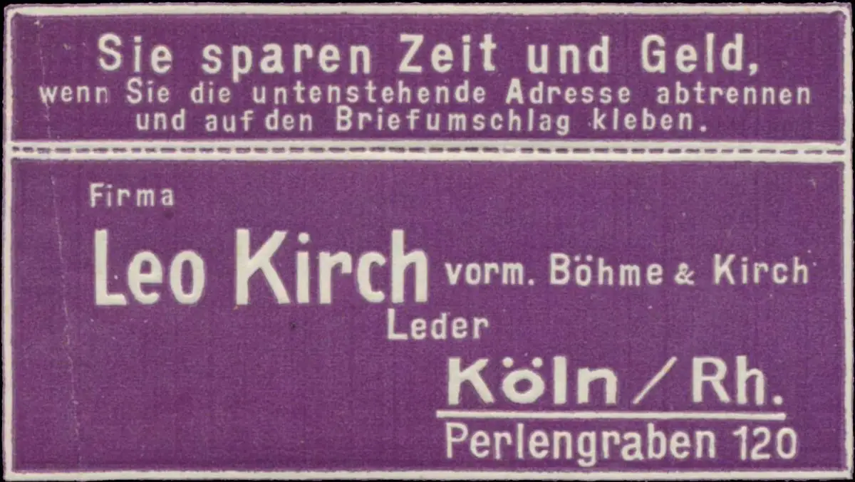 wenn Sie die untenstehende Adresse abtrennen und auf den Briefumschlag kleben. Perlengraben 120, Leder, Leo Kirch, vormals Böhme & Kirch, Größe/Zustand: 4x7 , leicht beschädigt, Original alte Reklamemarke die seinerzeit für die Werbung benutzt wurde