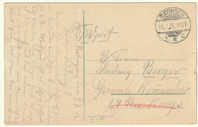 Bemerkungen: Feldpost gelaufen 1916 Ratingen [NRW] - Wien.