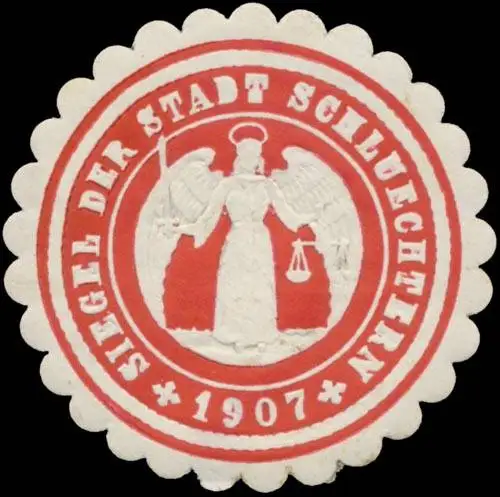 Schluechtern, Waage, Engel, rot, weiß, geprägt, Größe/Zustand: 4 , guter Zustand, Original Verschluss-Siegelmarke aus Papier welche früher von Behörden, Firmen etc. zum Versiegeln der Briefe benutzt wurden
