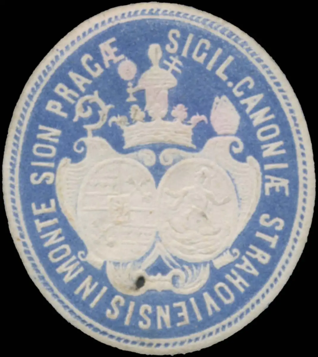 der Domherr von Strahov auf dem Berg Sion in Prag, canonia Strahoviensis in Monte Sion Pragae, Größe/Zustand: 3x3 , leicht beschädigt, Original Verschluss-Siegelmarke aus Papier welche früher von Behörden, Firmen etc. zum Versiegeln der Briefe benutzt wurden