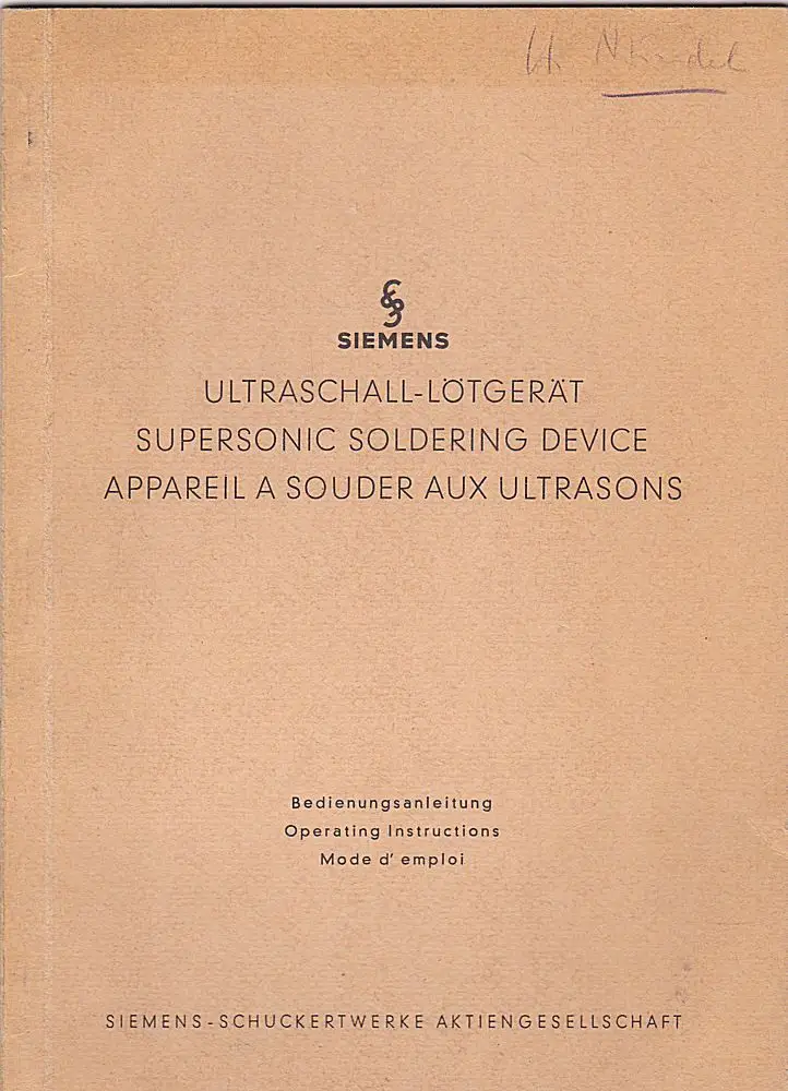 Siemens: Ultraschall-Lötgerät: Bedienungsanleitung, Supersonic Soldering Device: Operating Instructions, Appareil a souder aux ultrasons: Mode d'emploi.