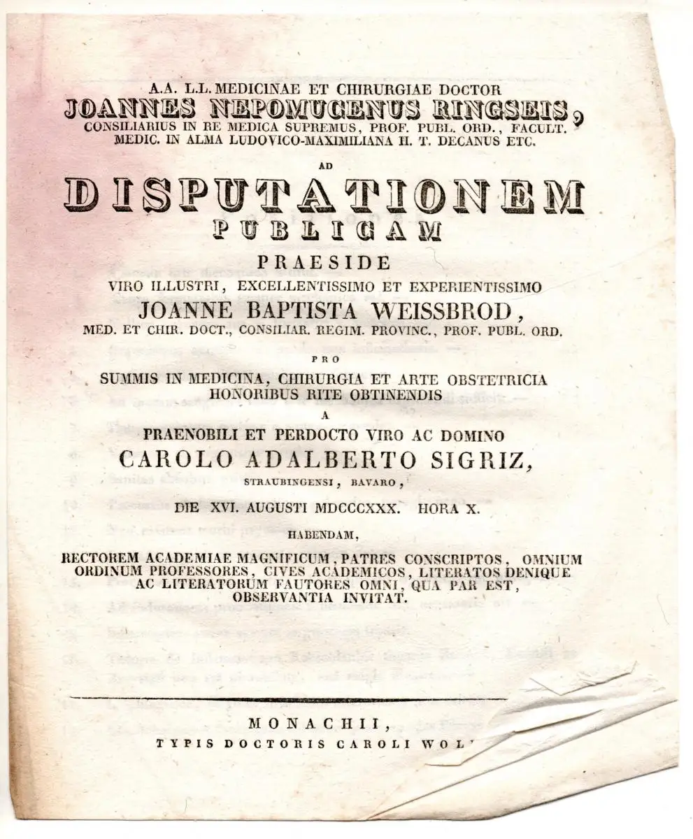 Präses: Johann Baptist Weissbrod; Disputatio: 1830-08-16, 2 Bl., 22 cm, Ecken geknickt, leicht rotfleckig.