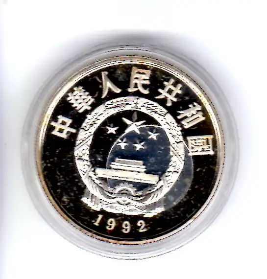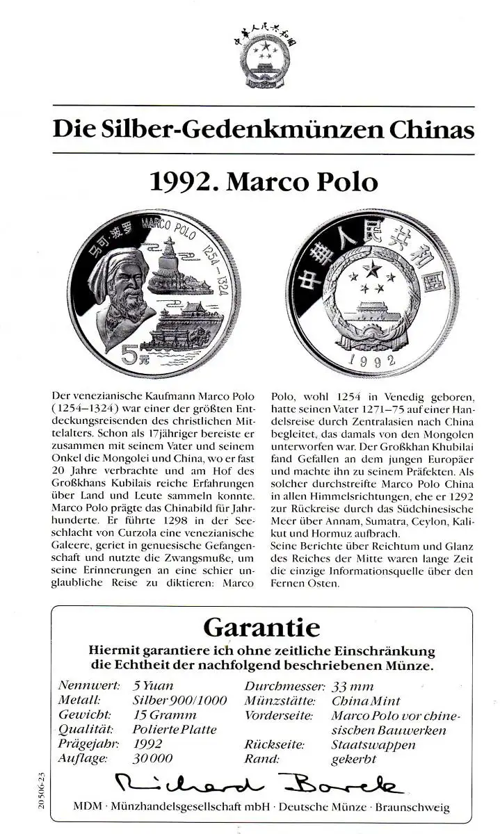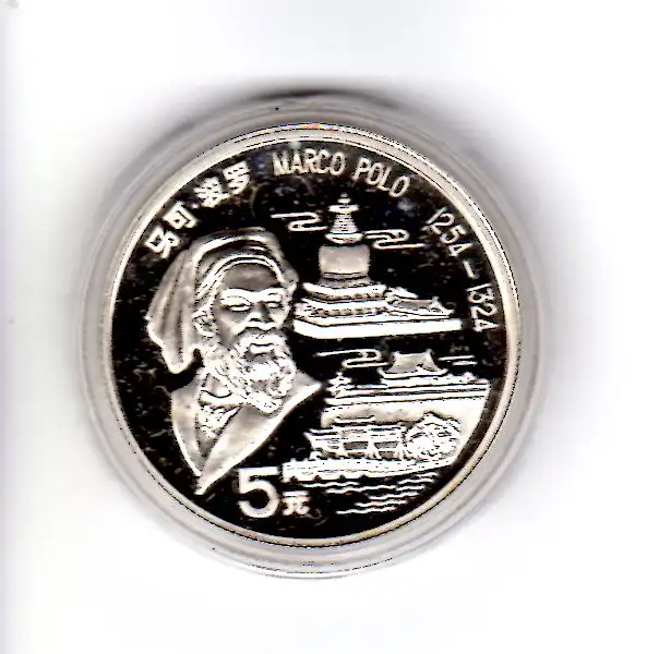 Chinesische Silbermünze 5 Yuan "Marco Polo" in Münzkapsel mit Zertifikat.