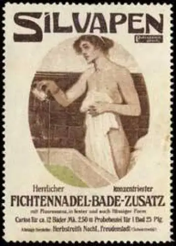 Fichtennadel-Bade-Zusatz, Größe/Zustand: 6x5 , leicht fleckig, Original alte Reklamemarke die seinerzeit für die Werbung benutzt wurde