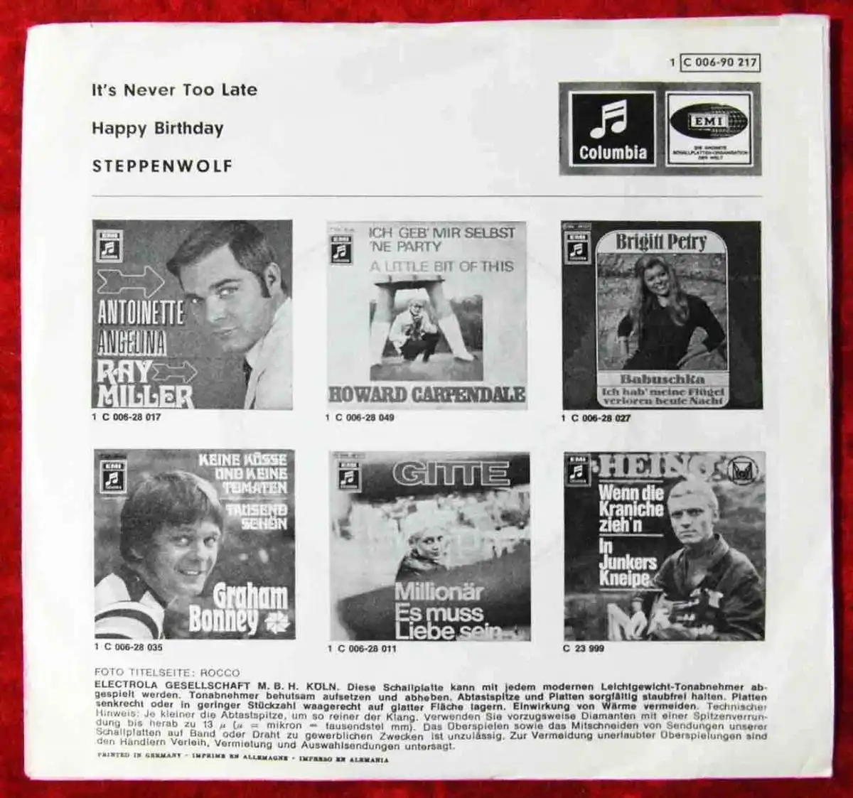 Single Steppenwolf: It´s Never Too Late (Columbia 1C 006-90 217) D 1969  Muster