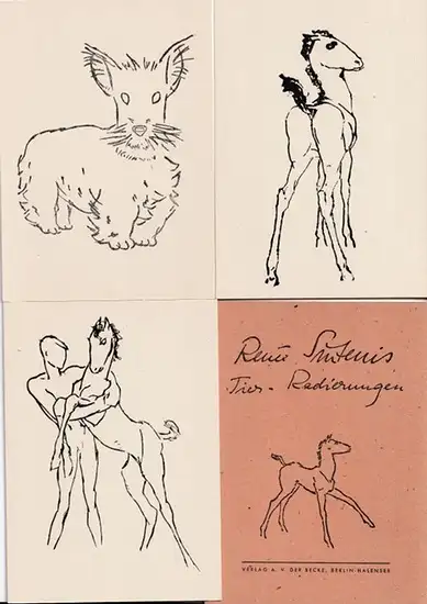 Freie Beschreibung: 14,8 x 10,8 cm. Illustrierter O-Pappumschlag. Innenliegend 6 Postkarten mit Original-Radierungen (lt. KVK so komplett) von Tieren (Fohlen, Junge mit Fohlen, Terrier…), entstanden 1921 - 1929. Sauberer, guter Zustand
