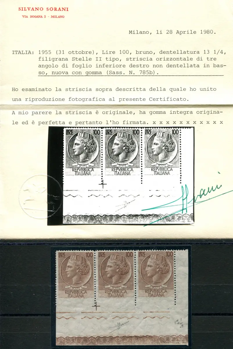 Siracusana l. 100 Sortenstreifen nicht gezahnt. Unten Vollgummi MNH - Syrakus l. 100 n. 785/Ic Horizontalstreifen von drei Exemplaren ungezähnt im unteren Vollbogenwinkel - Sehr schön für den Spezialisten dieser Ausgabe - Zert. Sorani - Kat. euro 1.800 Cod. 490/16