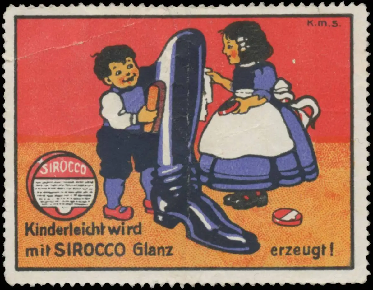 Kinderleicht wird mit Sirocco Glanz erzeugt, Schuhcreme, Größe/Zustand: 5x6 , leicht beschädigt, Original alte Reklamemarke die seinerzeit für die Werbung benutzt wurde