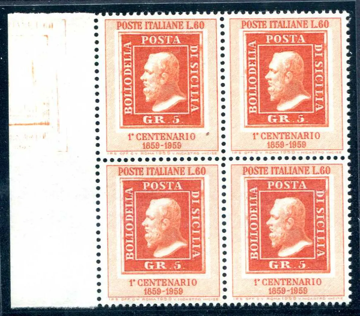 Sizilien Lire 60 scharfe Sorte Abdruck einer anderen Briefmarke am Rand Vollgummi - Sicilia Lire 60 Nr. 852 Viertel mit teilweisem, aber scharfem Abdruck einer anderen Briefmarke am Blattrand (Posiz. 51 del II. Gruppe) - Ungewöhnlich - Kat. euro 90 Code 738/3