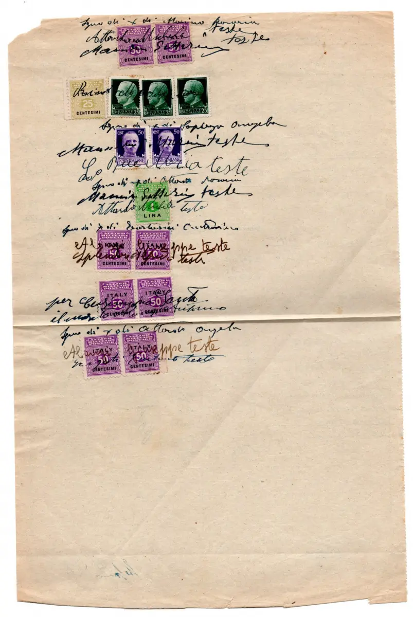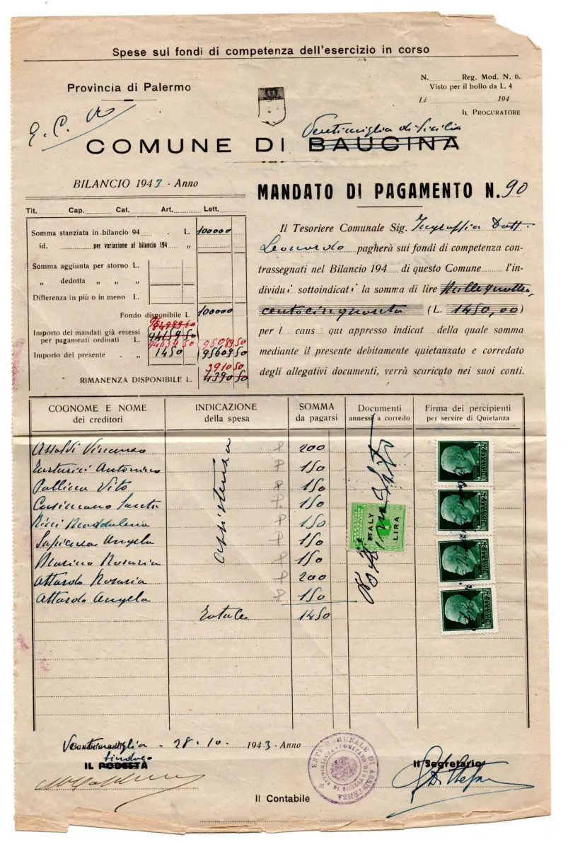 Sizilien Occ. Alliierte Zahlungsmandat Gemeinde Ventimiglia 1 Formular - Sizilien Occ. Alliierte - Zahlungsbefehl der Gemeinde Ventimiglia S. vom 28.10.43 mit zahlreichen steuerlich verwendeten Briefmarken zur Quittung auch gemischt mit Werten der Kaiserserie - Alle Marken sind mit der Autogrammsignatur der Cod. 1053/14 gestempelt