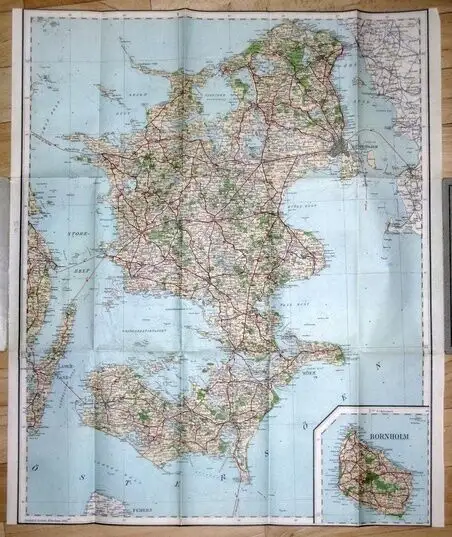 sehr guter Zustand, geringe Gebrauchs- und Alterungsspuren: Mappe teils etwas abgenutzt und Rückseite unten mit Eselsohr, Karte von Seeland, der größten Insel der Ostsee und von Dänemark / Danmark inkl. Kopenhagen / Kjöbenhavn, Bornholm, Möen, Langeland, Falster und Lolland Maalestok 1:320.000, kartoniert, ca. 10,5 x 20,5 (aufgefalten ca. 52 x 61)