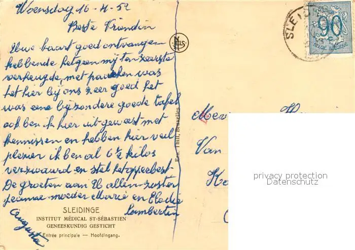 Sleidinge Institut Medical St Sebastien Entree principale Sleidinge postalisch gelaufen 1952 Erhaltung siehe scans [WerneD78] WernPID7