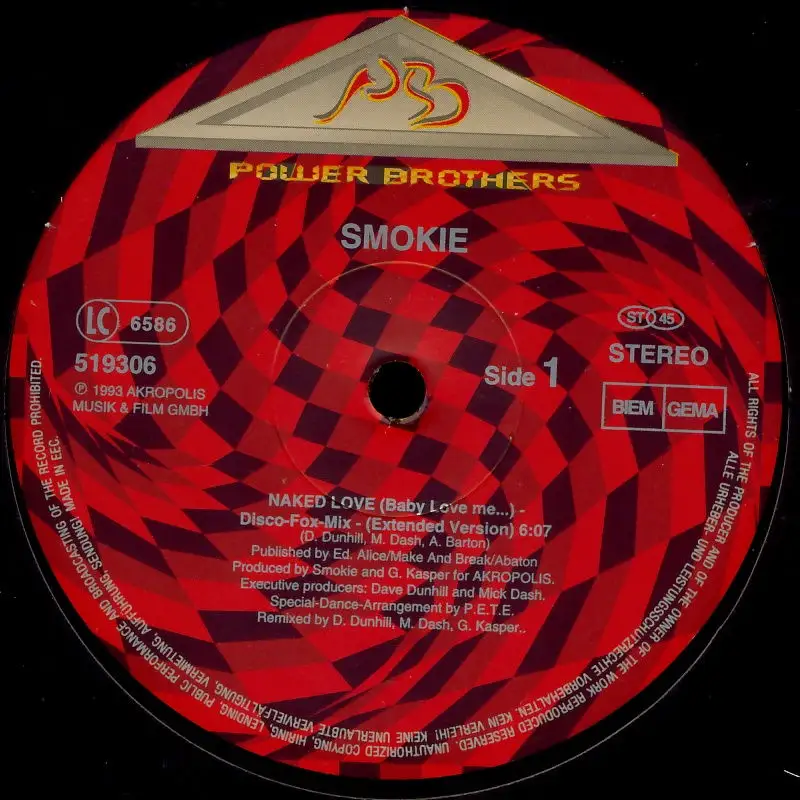 12" Maxi Smokie - Naked Love Baby Love Me, neutrales Cover, Zustand Platte VG; Made in Germany 1993 Power Brothers 519306, Tracks Disco Fox Mix, Ext. Vers. 6:07, Disco Fox Mix, Short Vers. 4:22, Album Vers. 4:17