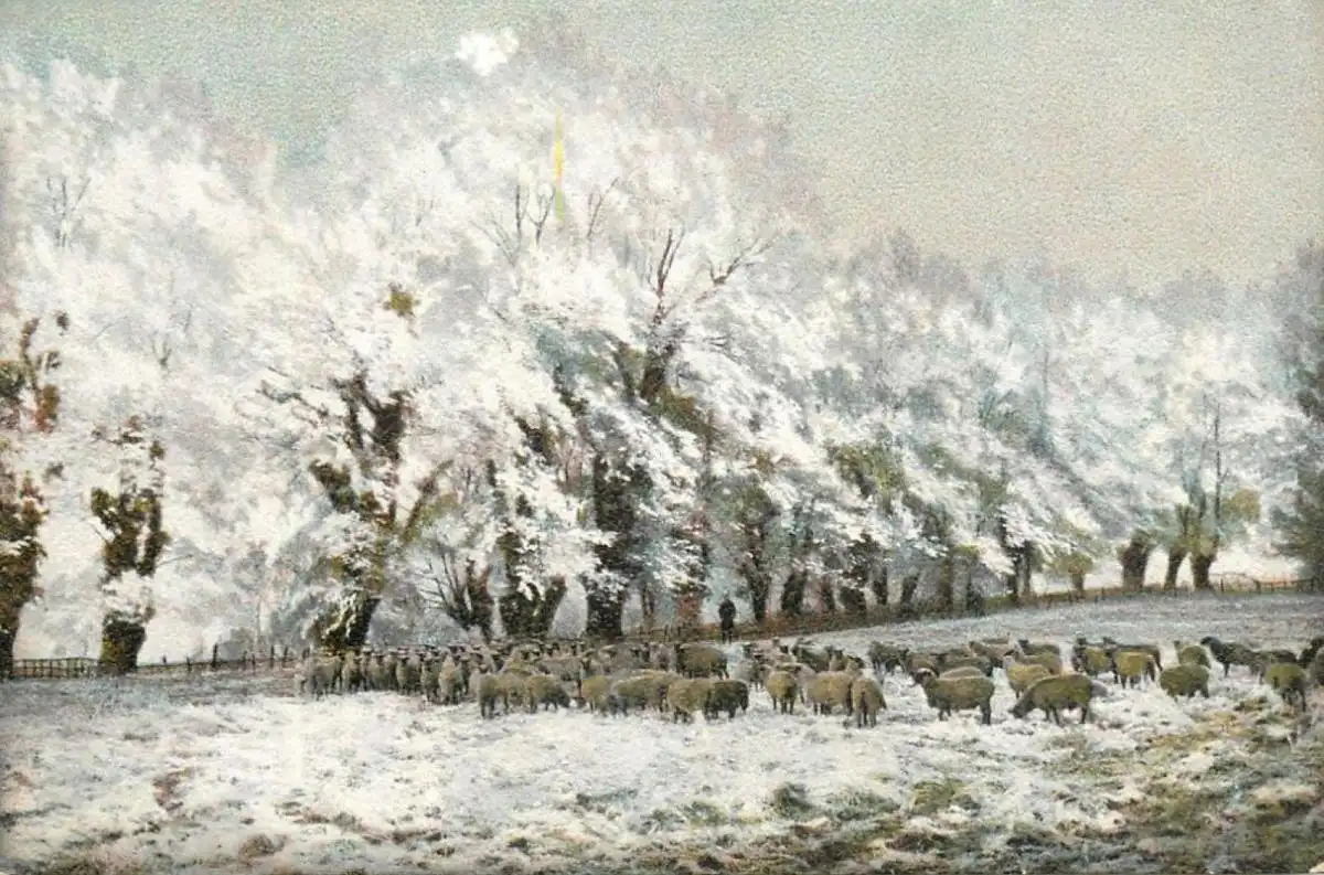 Snow scene with sheep old postcard