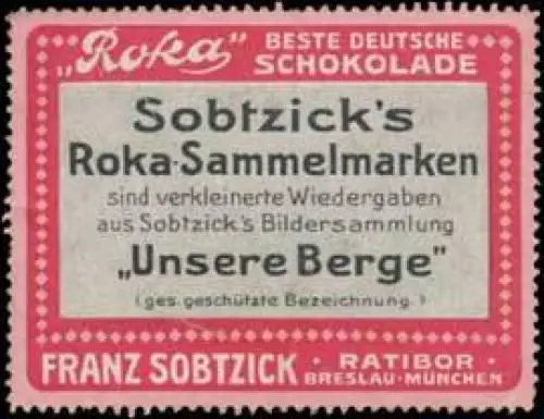 Roka beste deutsche Schokolade, Sobtzick's Sammlung: Unsere Berge, Größe/Zustand: 4x6 , guter Zustand, Original alte Reklamemarke die seinerzeit für die Werbung benutzt wurde