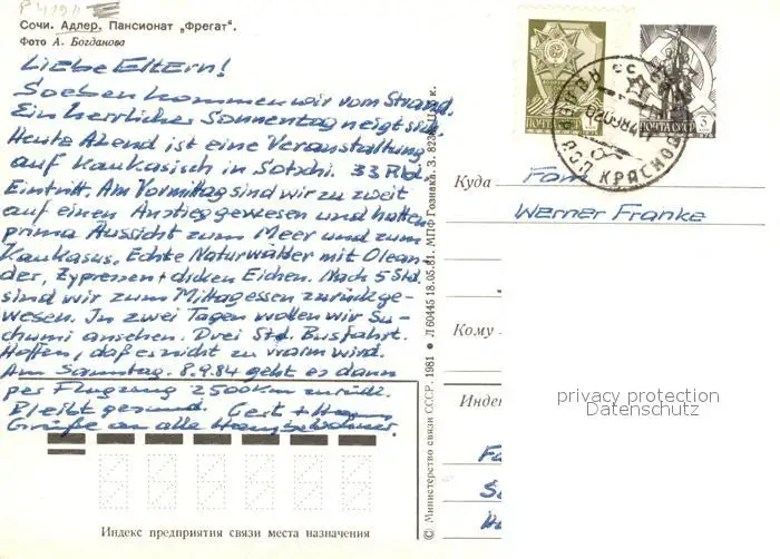 Sochi_Sotschi Adler Pensionat postalisch gelaufen nach 1965 Erhaltung siehe scans [IrynaD87] Iryn PID