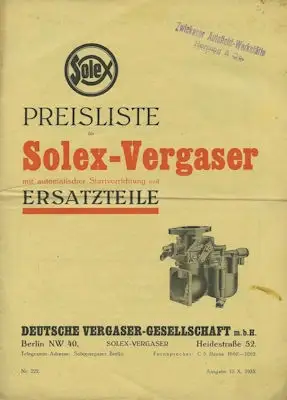 Solex Vergaser Ersatzteilliste Preisliste 10.1933