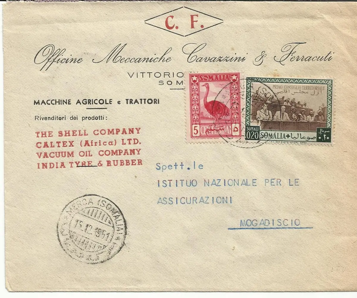 Somalia Afis - Territorialrat Cent. 20 + Ergänzung auf Umschlag aus der Ware - Somalia Afis - Territorialrat Cent. 20 Nr. 12 + Ergänzung Nr. 2 auf Umschlag von Merca nach Mogadischu am 15.12.51 - Interessanter interner Gebrauch Code 876/7
