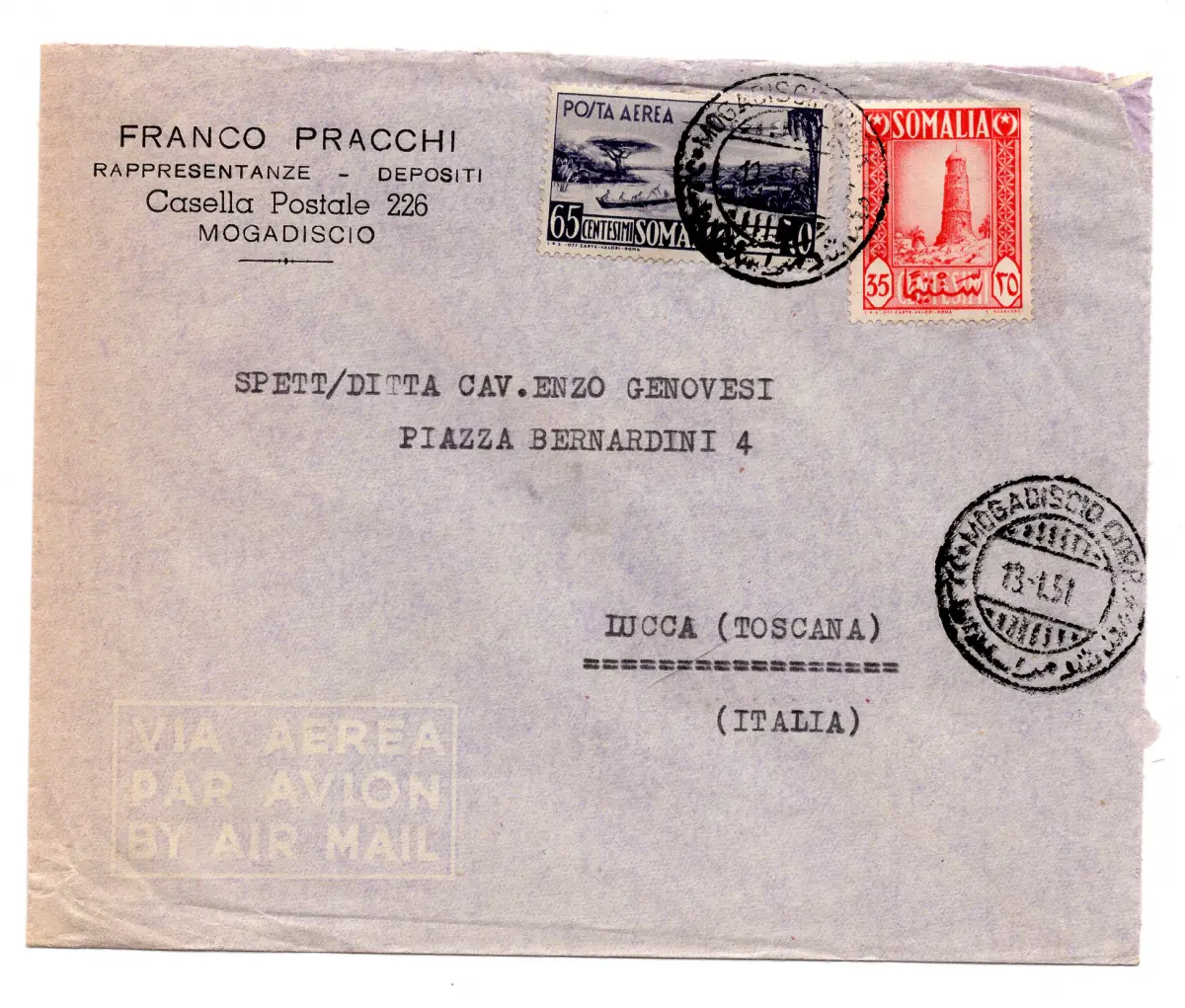 Umschlag - Somalia Afis - verschiedene Themen ca. 35 Nr. 7 + komplementäre P.A. Nr. 3 auf Luftumschlag nach Lucca am 13.1.51 - wertvolle Verwendung dieser beiden Tarifwerte - Kat. euro 580 Cod. 1082/17
