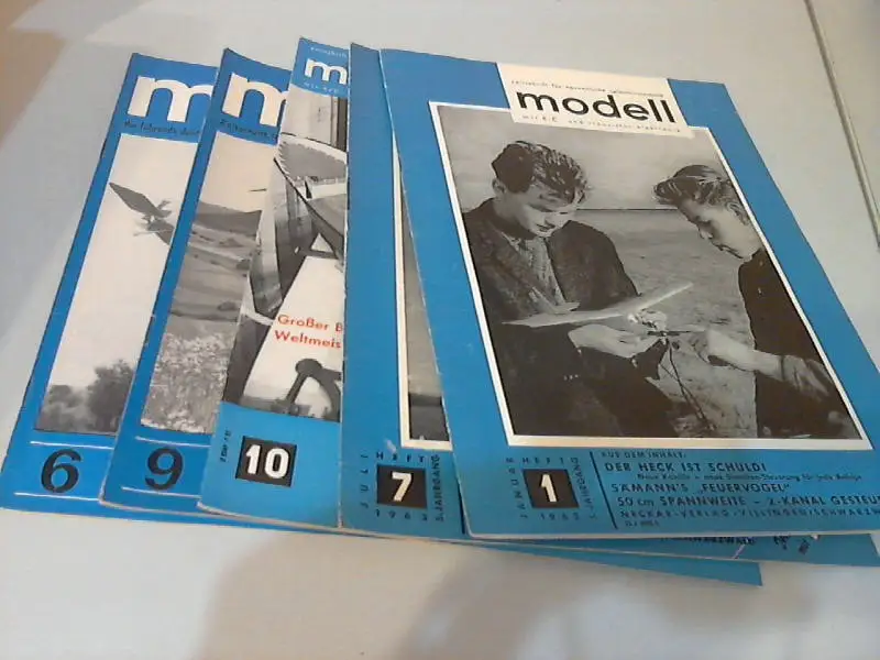 alle 5 Hefte sind altersbedingt in einem gutem, gebrauchten Zustand, »modell« ist die deutschsprachige Monatsschrift für Funksteuerung, den Fortschritt im Modellbau und der Elektronik im Selbstbau. Unter anderem aus den Inhalten: Der Wankel-Modellmotor - Kraft-Prop-Control, Digitalanlage - Pendelaudion mit integriertem Schaltkreis - R/C-Gigant Lear-Liner - micro-prop Digitalanlage - Test Merco .61 - Großer Messebericht - „Marabu", B. Giezendanner´s Meisterschafts-Modell - P. Demuth´s Motorenpflege - Das kleine Proportional-Brevier - Scale-Modell „Skyraider AD-6" - Speedwettbewerb in Harsewinkel - Steuerbare Gleichrichter-Thyristoren - Wettbewerb für vorbildgetreue Flugzeugmodelle - B. Huber´s Prop-Brevier: FAI-Kunstflugprogramm - Test Simprop Digi 2+1 - Das FAI-Programm: Mit den Augen des Punktrichters - R/C-Lastensegler Go 242 - Das Frisieren von Modellmotoren - R/C-STOL-Modell „Pilatus-Porter" - Das amerikanische Kunstflugprogramm - Der Transdipper - R/ C-Modell "Ju 52" - „ Teleprop" -Selbstbau-Digitalanlage - Test FMO-Boxermotor-Glühzünder - R/ C-Hubschrauber in Harsewinkel - teleprop-Selbstbau-Dlgitalanlage (Empfänger, Servos, Preise, Bezugsquellen) Maßstabgetreue Flugzeugmodelle, Teil 2 - Graupner, Grundig Varioprop - R/C-Nurflügel - Nachlauf maschine zur Webra-Picco - Test Multiplex Digitron 3 - Test Supertiger G 40 und G 46 Beschreibung vom Antiquariat Ardelt 3a6a Antiquariat Ardelt