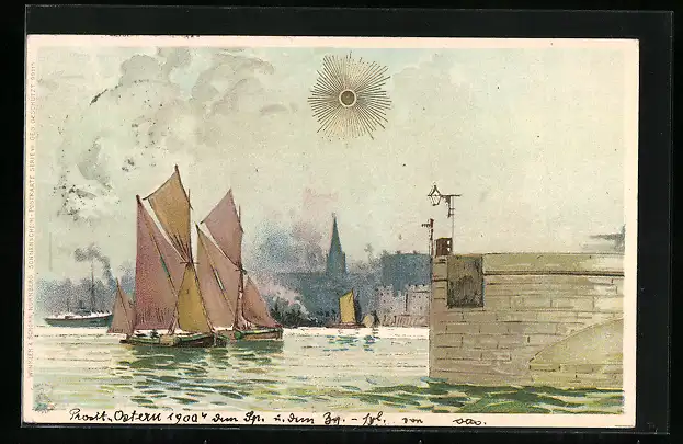 Sonnenschein-AK Kleine Segelboote, im Hintergrund eine Stadt