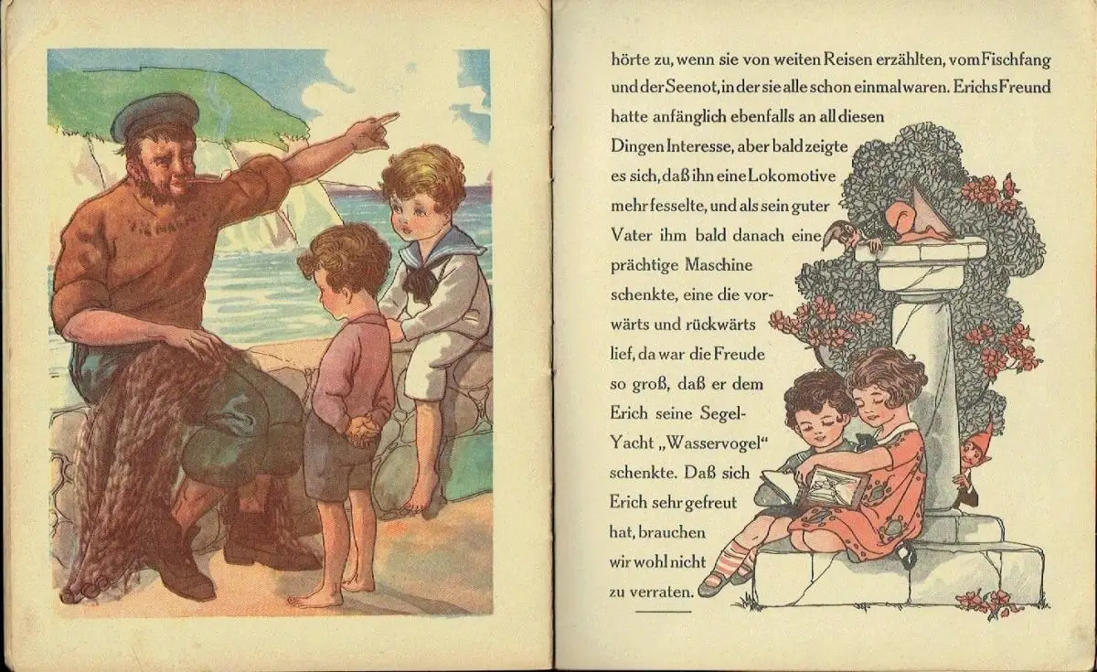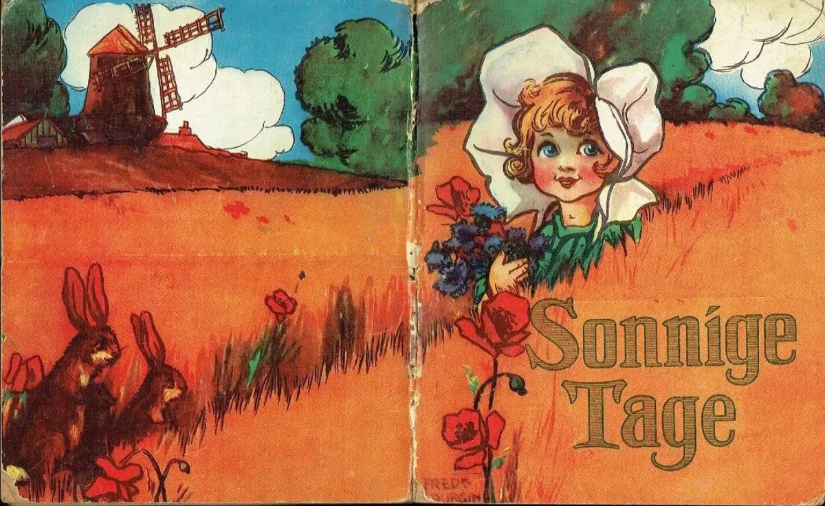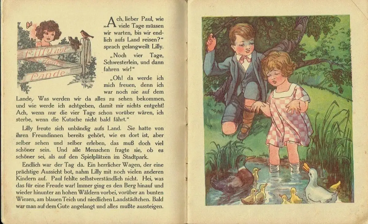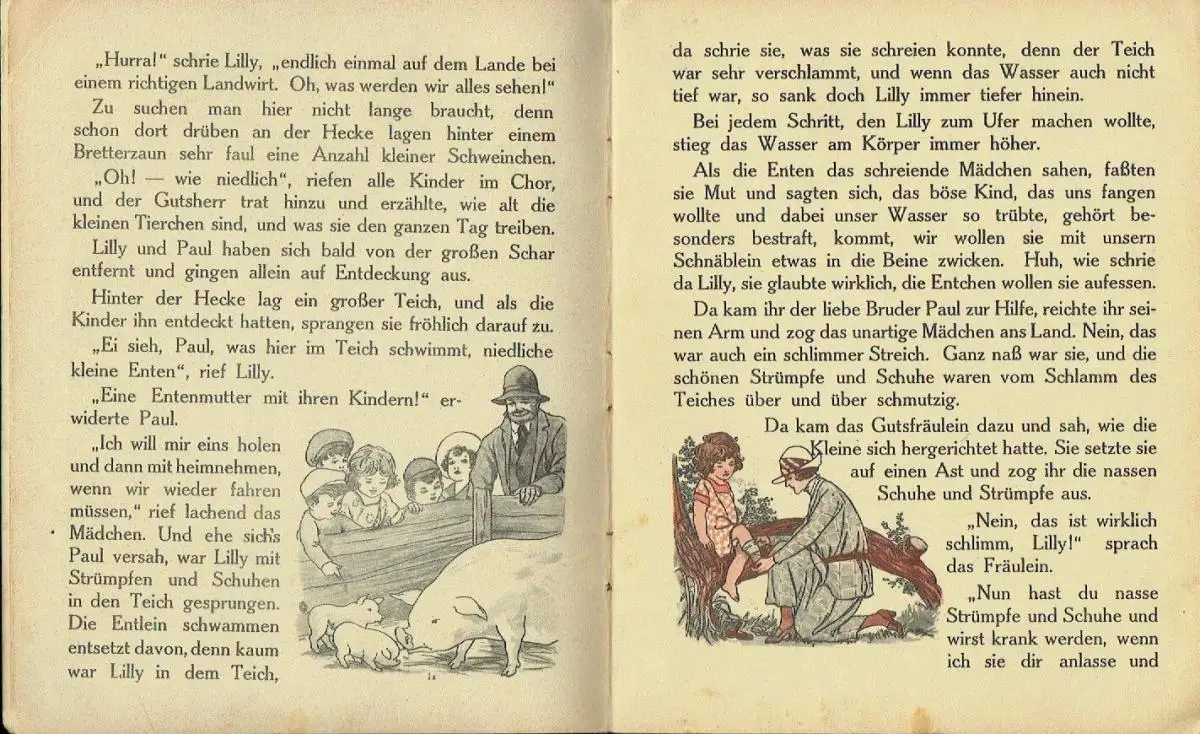 noch guter Zustand, geringe Gebrauchs- und Alterungsspuren - Einbandecken und -kanten teils mehr oder weniger abgenutzt - Rücken ziemlich beschabt und abgenutzt - beide Deckel und Seiten teils mehr oder weniger eselsohrig - Seiten überwiegend sauber und ordentlich, gelegentlich gering fleckig - von 6 Blatt sind die oberen Ecken abgeschnitten (hatten offenbar Beschädigungen, die so "entsorgt" wurden) ohne Text- oder Bildverlust, enthält Kurzgeschichten für ca. 9jährige - Lilly auf dem Lande - Der kleine Angler - Erichs Papier Boot - Sei nicht habgierig ! das Deckelbild ist links unten signiert, aber nicht vollständig lesbar: Fred K. ??urgin (da das K etwas hochgestellt ist, könnte es auch Abkürzung für z. B. Frederick sein), Hardcover, ca. 18 x 22, 24 Seiten mit 6 farbigen Bildtafeln und 17 kleineren, teils mehrfarbigen Bildern