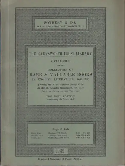 Sotheby & Co: The Harmsworth Trust Library: Catalogue of the Collection of Rare & Valuable Books in English Literature, 1641 - 1785. The first and second Portion. 1145 Positions.