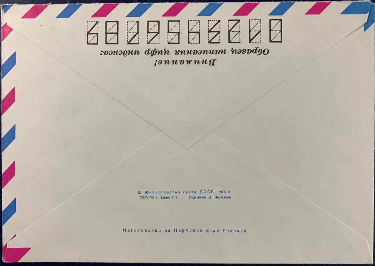Ganzsache Aerogramm zum gemeinsamen Flug von Apollo und Sojus, gelaufen mit Sonderstempel vom 15.07.1975, Thema: Startphase von Sojus 3 in Baikonur.