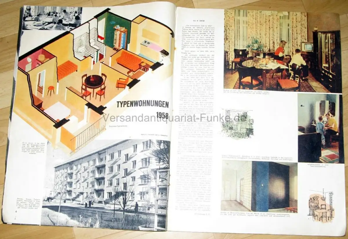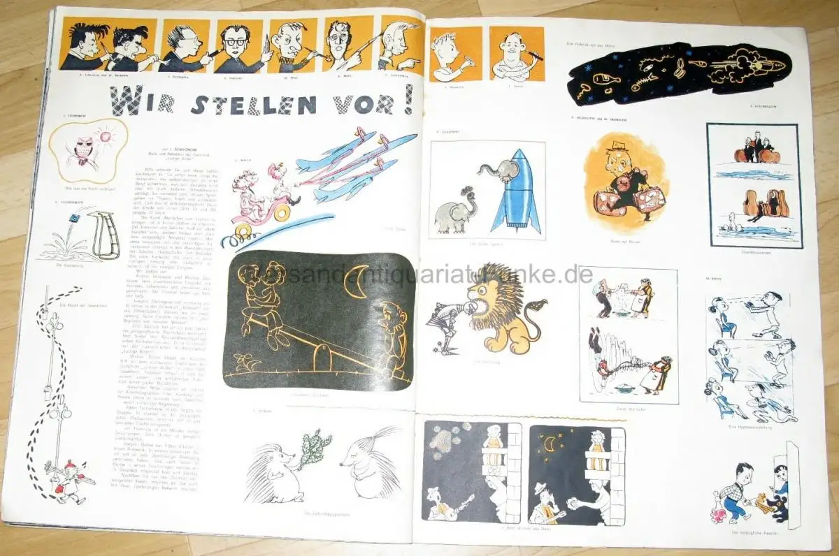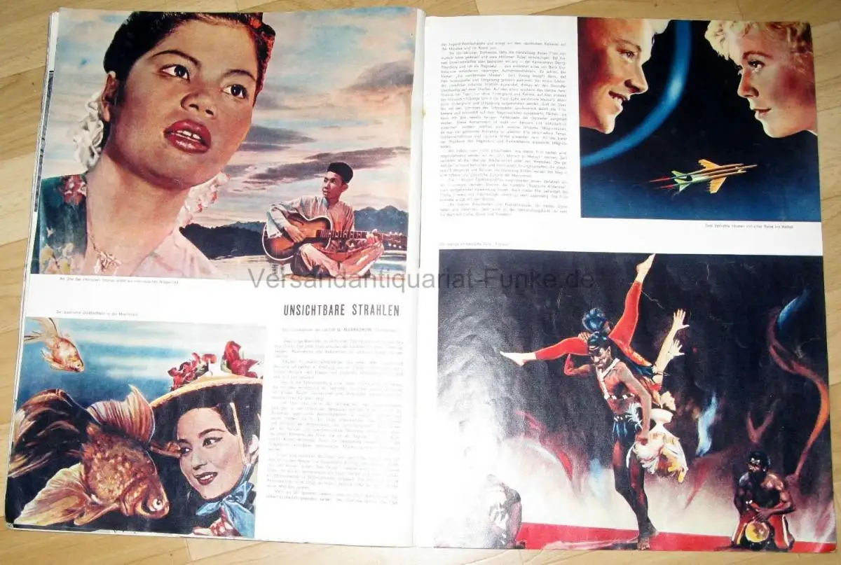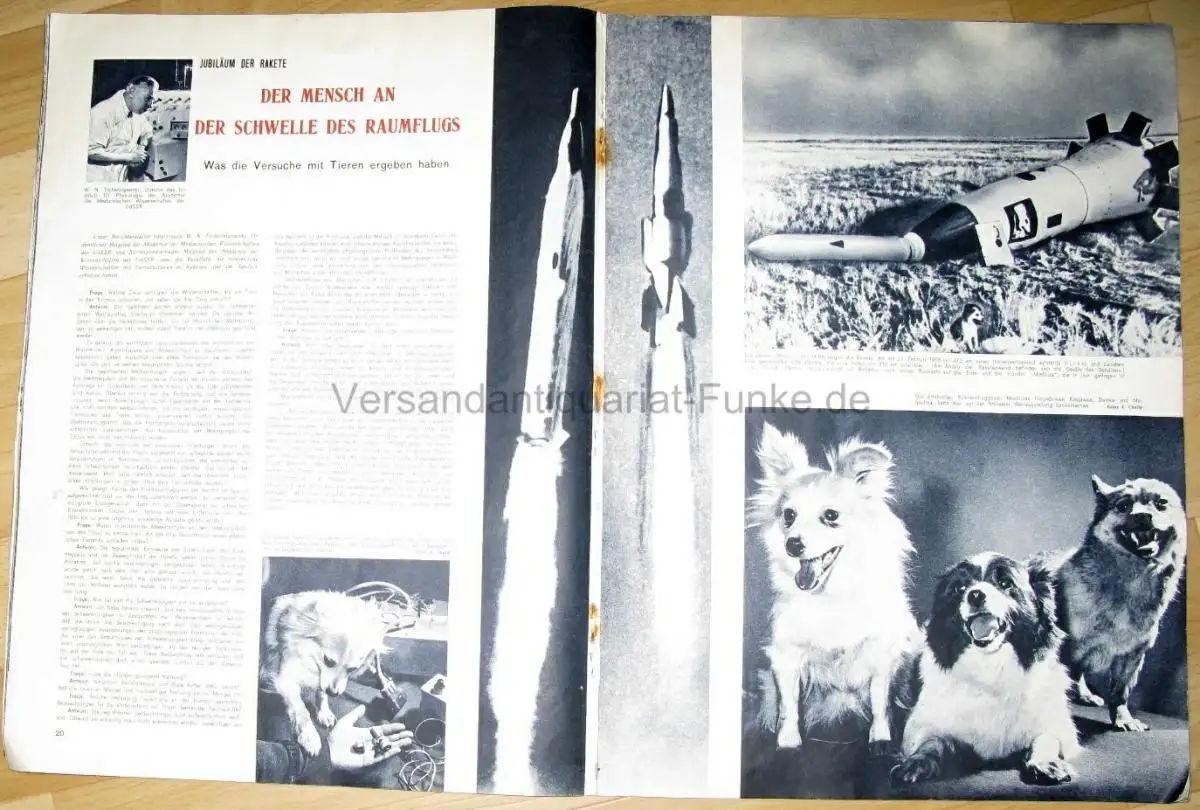 guter Zustand, geringe Gebrauchs- und Alterungsspuren: Umschlag und Seiten teils etwas eselsohrig - die stark rostenden Klammern habe ich entfernt und durch neue ersetzt, geblieben sind an den Stellen der alten kleine Rostflecke und kleine Fehlstellen im Papier - Seiten sonst sauber und ordentlich, gelegentlich leicht knittrig, Jubiläum der Rakete - Der Mensch an der Schwelle des Raumfluges - Was die Versuche mit Tieren ergeben haben - Unser Handel mit England - Typenwohnungen 1958 - Halbstündige Herzabschaltung (Forschungsinstitut für chirurgische Versuchsapparate) - In der Nähe der Kursker Magnetanomalie - Lieder, die die Welt erobern - Kurzberichte zum Zeitgeschehen - Tschechow in London - Gastspiel des Moskauer Künstlertheaters - Unsichtbare Strahlen (Filmkunst) - Die Vierzehnte (Stahlherstellung) - Mode für die Frau - 2 Seiten Karikaturen von verschiedenen Zeichnern - Musikfrühling der Welt - Der internationale Tschaikowski-Wettbewerb - u. a, kartoniert, ca. 30 x 40, 40 Seiten mit zahlreichen Bildern