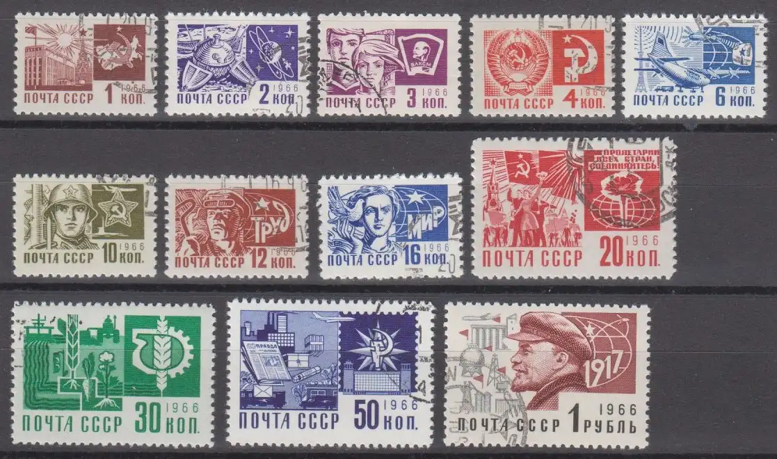 Freimarken: Gesellschaft und Technik: Staatsmacht / Landung auf dem Mond / Komsomol / Staatswappen / Luft- und Raumfahrt / Rote Armee / „Arbeit“ / „Frieden“ / „Proletarier aller Länder vereinigt euch!“ / Chemische Landwirtschaft / Post- und Fernmeldewesen / Lenin und seine Errungenschaften