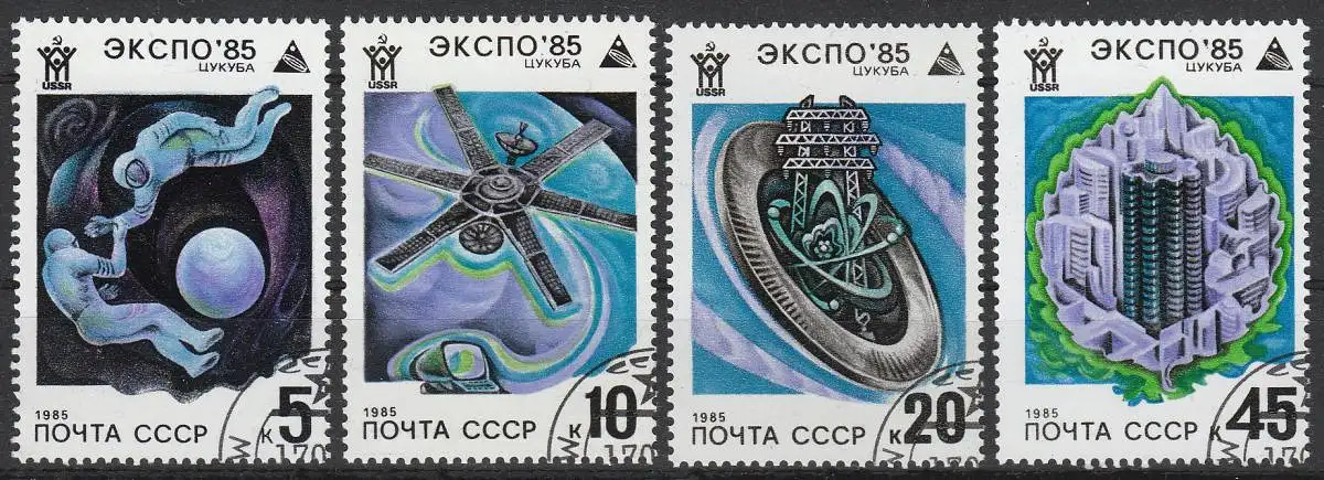 Sonderausstellung EXPO ’85, Tsukuba: Kosmonauten (Weltraumforschung) / Satellit (Nachrichtentechnik) / Energieforschung / Städtebau / Emblem des sowjetischen Pavillons