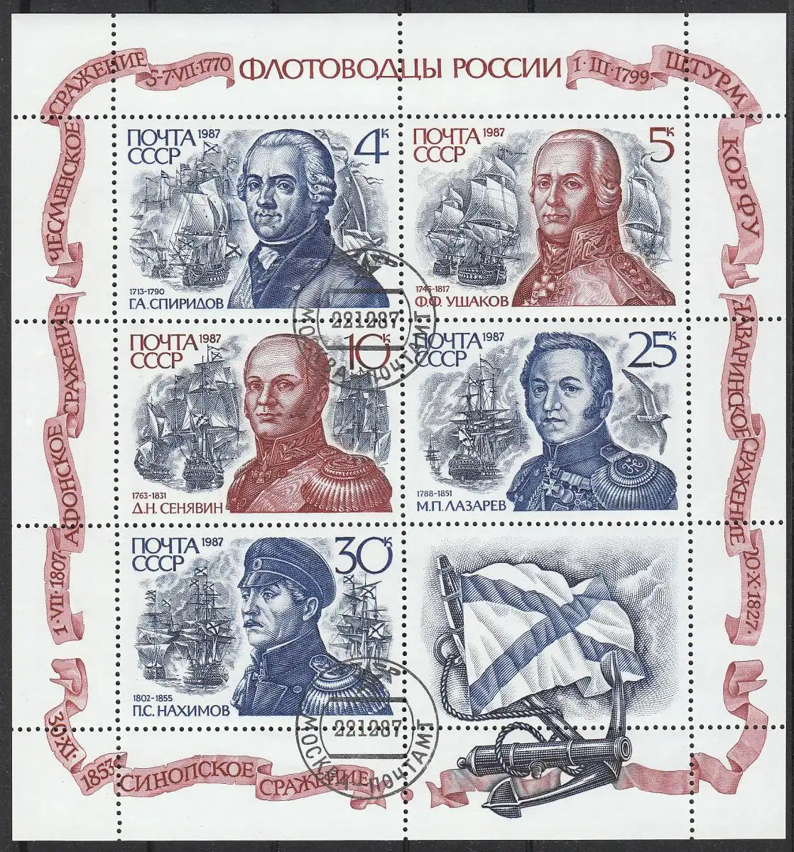 Russische Flottenbefehlshaber: Grigorij Spiridow (1713-1790) / Fjodor Uschakow (1745-1817) / Dmitrij Senjawin (1763-1831) / Michail Lasarew (1788-1851) / Pawel Nachimow (1802-1855) / Zierfeld
