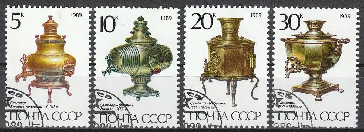 Russische Samoware: Birnenförmiger Samowar (Ende 18. Jh.) / Samowar-Fässchen (Anfang 19. Jh.) / Reise-Samowar „Kabatschok“ (1830/40) / Vasenförmiger Samowar (1840/50) - Zähnung teilweise etwas kurz!