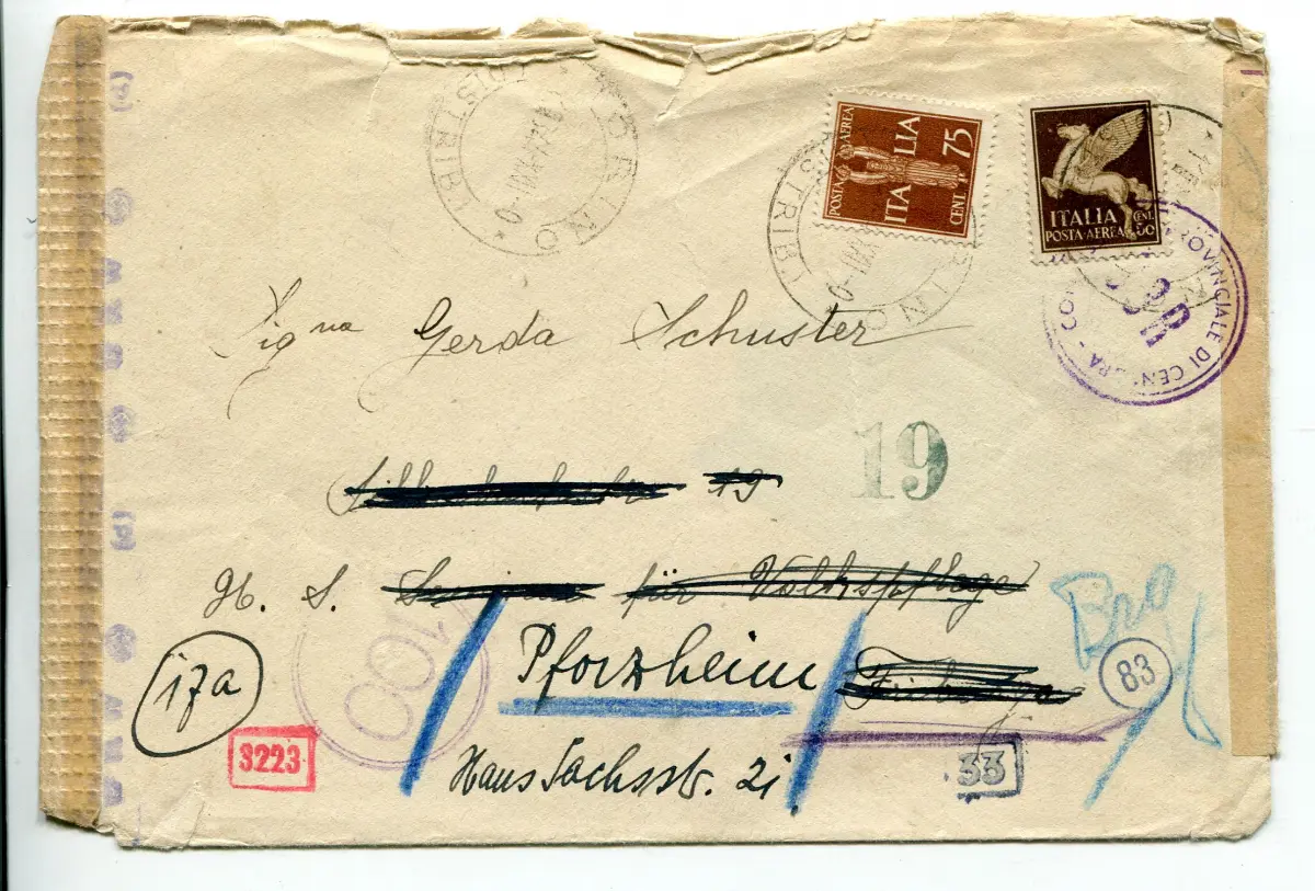 - Späte Verwendung - Briefmarken Königreich P.A. Cent. 50 und 75 (Nr. 11 + 12) auf Umschlag von Turin nach Freiburg am 11.3.44 - seitlich Kabelbinder und Ann. der Zensur 33R Nr. 693/A