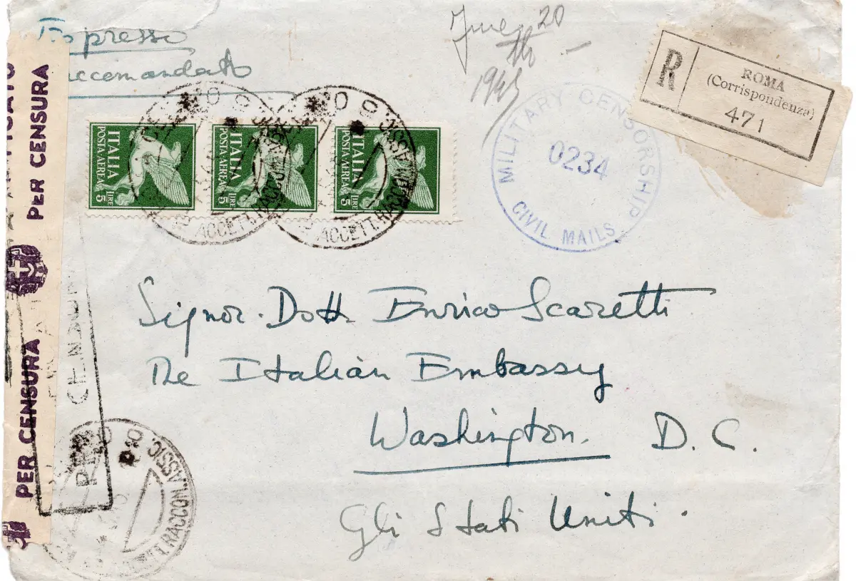 Umschlag - Späte Verwendung - Luftpost Lire 5 Nr. 16 Dreierstreifen auf Umschlag Racc. für die USA am 4.5.45 - ein Exemplar mit defektem Winkel - seitlich Schelle und Ann. der Zensur + weitere Ann. Military Censorship Civil Mails - Auf dem handgeschriebenen Umschlag des Express-Absenders wurde der Service am 15.10. reaktiviert, daher wurde der Umschlag nur als ausländisches Einschreiben frankiert - Uncommon Cod. 228/17