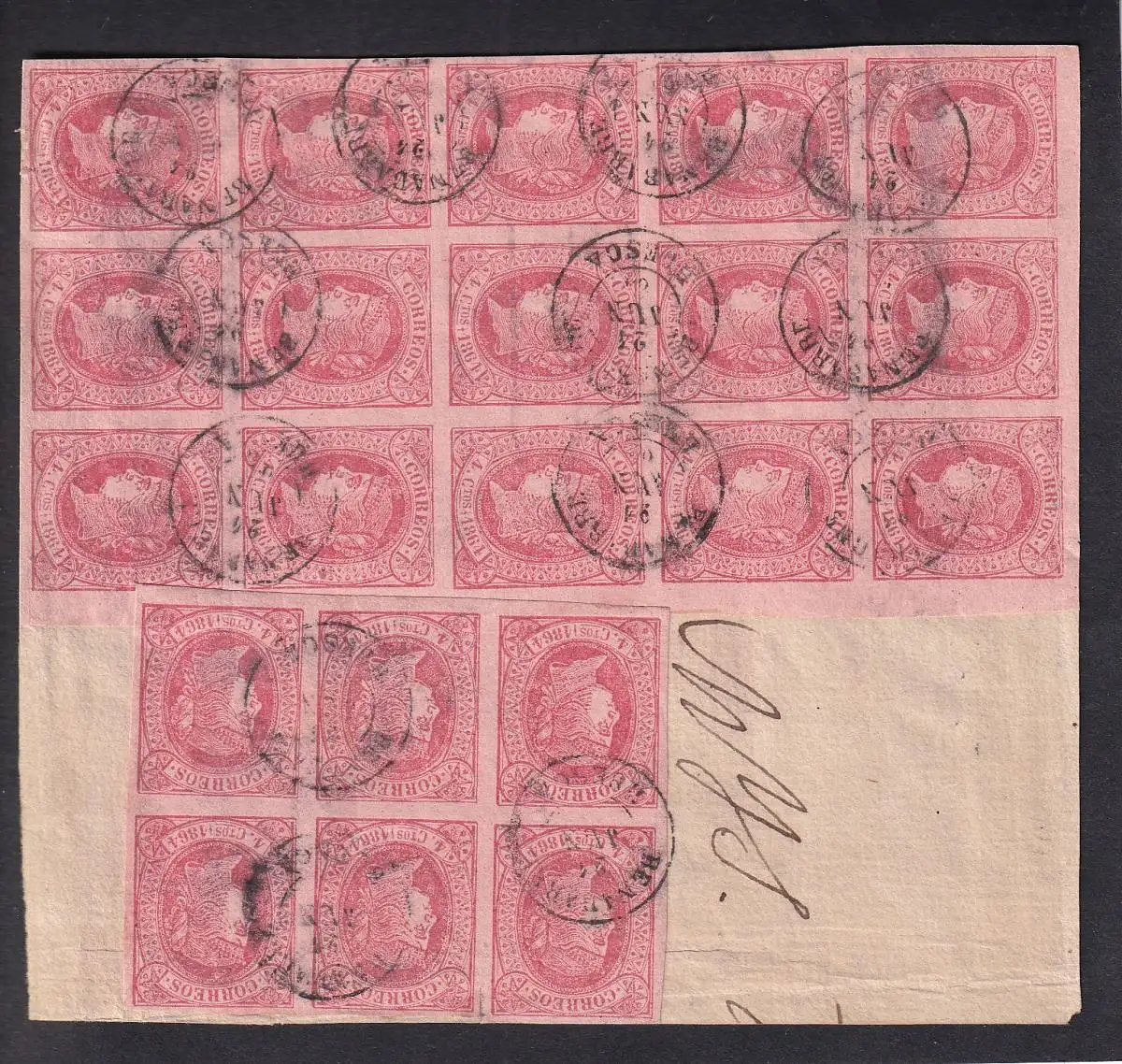 SPANIEN 1864 ISABELLA II 12 Cs/ Ed 65/ Mi 57 15er+6er BLOCK BRIEFSTÜCK/ PIECE von BENABARRE/ HUESCA